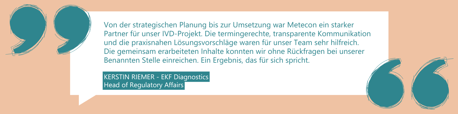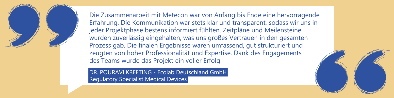 Die Metecon GmbH ist eine der Pionierinnen in Deutschland, wenn es um die norm- und richtlinienkonforme Beratung und Unterstützung für Medizinproduktehersteller und Hersteller von IVD geht: Seit 1999 sind wir strategischer Partner unserer Kunden bei der Erstellung und Pflege von Produktakten für Medizinprodukte und IVD, bei der Verifizierung und Validierung dieser Produkte, für alle Aspekte in den Bereichen Clinical Affairs und Regulatory Affairs sowie bei der Optimierung von Qualitätsmanagementprozessen.