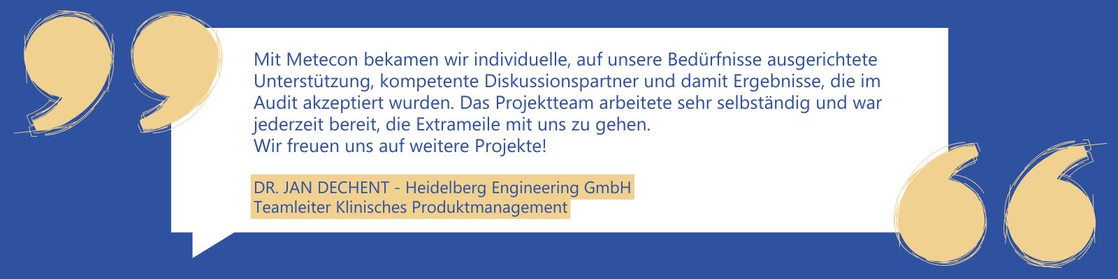 Unser Team ist Ihre verlässliche Größe, wenn es um die Dokumentation, Verifikation, Validierung, den Marktzugang und die Marktbeobachtung (PMS, PMCF/PMPF) Ihres Medizinprodukts oder IVDs geht. Kapazitätsengpässe sind mit Metecon passé; wir unterstützen Sie mal punktuell, mal über eine längere Strecke, aber immer zuverlässig und lösungsorientiert. Wir wachsen kontinuierlich, so dass wir Ihre Anfrage flexibel und schnell bedienen können.